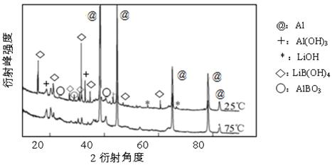 ②下图为25℃和75℃时,Al-LiBH4复合材料[ w (LiBH4)=25%]与水反应一定时间后产物的X-射线衍射图谱(X-射线衍射可用于判断某晶态物质是否存在,不同晶态物质出现衍射峰的衍射角不同)。