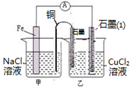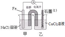 (3)如图其它条件不变,若将盐桥换成弯铜导线与石墨相连成n型,如图所示,石墨(1)为    极(填“正”、“负”、“阴”或 “阳”)。在甲装置中滴加几滴酚酞试液,振荡均匀,一段时间后,在甲装置中观察到     电极(填“铁”或“铜”)附近溶液先变红,该电极的反应式为                 。