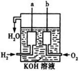(3)美国阿波罗宇宙飞船上使用了一种新型装置,其构造如右图所示:a、b两个电极均由多孔的碳块组成,一极通入H2 ,另一极通入O2,则 (填物质化学式)失电子作负极;正极电极反应式为: ;电池总反应为: 。