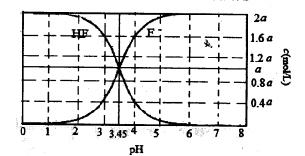 试题分析:A.当pH>3.45时,c(F-)>c(HF),溶液可能呈酸性、中性或碱性,A错误;B.pH=3时,c(H+)>c(OH-),溶液中存在c(Na+)+c(H+)=c(OH-)+c(F-),则c(F-)>c(Na+),B错误;C.HF为弱酸,恰好反应时溶液应成碱性,当pH=3.45时HF酸过量,C错误;D.当pH=4时,c(F-)=1.6amol/L,c(HF)=0.4amol/L,溶液中存在c(Na+)+c(H+)=c(OH-)+c(F-),c(F-)=c(Na+)+c(H+)-c(OH-)=1.6amol/L,则c(HF)+c(Na+)+c(H+)-c(OH-)=2amol?L-1,D正确;选D。