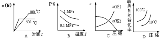试题分析:A、该反应是放热反应,所以温度升高,平衡逆向移动,N的浓度增大,所以平衡时温度高的曲线在温度低的曲线的上方,错误;B、温度升高,平衡逆向移动,P的含量减少,所以曲线向下,增大压强,平衡正向移 动,P的含量增大,则压强大的曲线在压强小的曲线的上方,正确;C、增大压强,正逆反应的速率都增大,错误;D、增大压强,平衡正向移动,M的转化率增大,曲线向上,温度升高,平衡逆向移动,M的转化率降低,则温度高的曲线在温度低的曲线的下方,错误,答案选B。