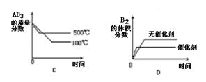 试题分析:A、研究图像,从交点以后进行研究,根据勒夏特列原理,升高温度平衡正向移动,v正>v逆,错误;B、先看线的走向,随压强的增加,平衡向正反应方向移动,A2的转化率增大,错误;C、看拐点,先拐点说明温度高,然后看温度对平衡的影响,温度升高,反应向正反应方向进行,AB3的质量分数增加,正确;D、催化剂对化学平衡无影响,B2的体积分数相等,错误。