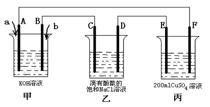 (3)甲醇燃料电池是符合绿色化学理念的新型燃料电池,下图是以甲醇燃料电池(甲池)为电源的电解装置。已知:A、B、C、D、E、F都是惰性电极,丙中为0.1 mol/L CuSO4溶液 (假设反应前后溶液体积不变),当向甲池通入气体a和b时,D极附近呈红色。回答下列问题: