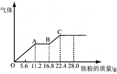 =0.4mol,因此混合 酸中HNO3物质的量0.4mol,故D正确;第二份反应消耗22.4g铁,物质的量为22.4g÷56g/mol=0.4mol。所有的铁元素都在硫酸亚铁中,根据硫酸根守恒可知,每份含硫酸0.4mol,所原混合酸中H2SO4物质的量为0.4mol×2=0.8mol,浓度为4mol/L,A不正确;C、由图象可知,OA段发生反应为:Fe+NO3-+4H+=Fe3++NO↑+2H2O。由于铁过量,AB段发生反应为:Fe+2Fe3+=3Fe2+,BC段发生反应为:Fe+2H+=Fe2++H2↑,故B正确;酸全部被还原,铁元素全部以硫酸亚铁的形式存在于溶液中,所以溶液中最终溶质为FeSO4,故C正确,答案选A。