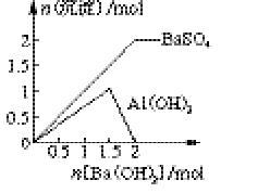 (2)根据反应式2KAl(SO4)2+3Ba(OH)2=K2SO4+3BaSO4↓+2Al(OH)3↓可知,当加入1.5mol氢氧化钡时生成1.5mol硫酸钡和1mol氢氧化铝。根据反应式KAl(SO4)2+2Ba(OH)2=KAlO2+2BaSO4↓+2H2O可知,当加入2mol氢氧化钡时,生成的氢氧化铝又溶解生成偏铝酸钠,此时硫酸钡的沉淀达到最大值,因此图像可表示为