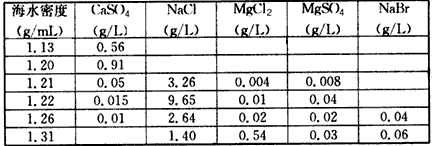 填空题 海水中含有多种盐类物质,在一定温度下将海水不断浓缩,其间会不断有晶体析出,且海水的密度逐渐增大,下表为一定温度下不同密度的海水中几种盐类的含量(g/L)。