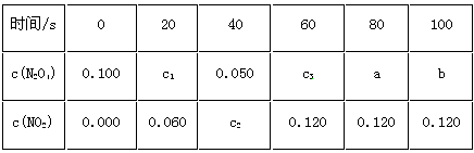 填空题 在100℃时,将0.200 mol的四氧化二氮气体充入2L抽空的密闭容器中,每隔一定时间对该容器内物质的浓度(mol/L)进行分析,得到如下表格:
