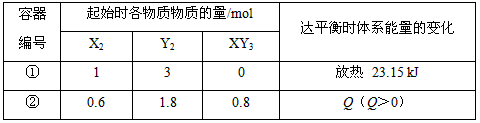 2XY3(g) △H=-92.6 kJ·mol-1 实验测得反应在起始、达到平衡时的有关数据如下表所示