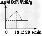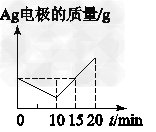 选择题 将质量相等的Ag片和铂片插入硝酸银溶液(足量)中,银片与电源正极相连,铂片与电源负极相连。以电流1 A通电10 min,然后反接电源,以电流2 A继续通电10 min。图为表示银电极的质量、铂电极的质量、电解池中产生气体的质量和电解时间的关系图,正确的是[???? ]