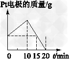 选择题 将质量相等的Ag片和铂片插入硝酸银溶液(足量)中,银片与电源正极相连,铂片与电源负极相连。 91exam.org以电流1 A通电10 min,然后反接电源,以电流2 A继续通电10 min。图为表示银电极的质量、铂电极的质量、电解池中产生气体的质量和电解时间的关系图,正确的是[???? ]