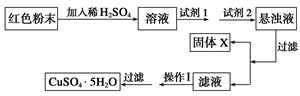 | Cu2+ | 6.0 | 10 实验小组设计如右图实验方案: ![]() 试回答: ①试剂1可以为________________,试剂2可以为________________。 ②固体X的化学式为____________。 ③操作Ⅰ为____________________。 实验题 (9分)某校一化学实验小组通过实验分析,确定一红色粉末为Fe2O3和Cu2O的混合物。
