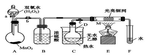 本题答案:(10分)(1)2H2O22H2O+O2↑。由于生成的氧气中含有水蒸气,所以B装置中浓硫酸的作用是干燥氧气。而装置C的作用是使D 91eXaM.org中乙醇变为蒸气进入M中参加反应。