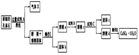 试题分析:试剂A的化学式是H2SO4要反应掉孔雀石,而且要制备胆矾,不引人杂质,所以只能是硫酸;操作I的名称是过滤;操作Ⅱ用到的仪器有,酒精灯、玻璃棒、蒸发皿、坩埚钳和三角架。