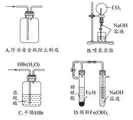 选择题 下列能达到实验目的的是本题答案:B本题解析:A中若液体倒吸入广口瓶,由于左边导管在瓶底,液体会继续倒吸,不能起到安全瓶的作用;B项CO2被挤入的NaOH溶液吸收,压强减小,喷泉形成;C项HBr能被浓硫酸氧化;D项关闭止水夹后,H2仍然送出,不能将NaOH溶液压入左边的试管,因而不能制取Fe(OH)2。