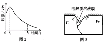 | ③ | ? | 0.2 | 2.0 | 90.0 (2)编号①实验测得容器中压强随时间变化如图2。t2时,容器中压强明显小于起始压强,其原因是铁发生了?????????????腐蚀,请在图3中用箭头标出发生该腐蚀时电子流动方向;此时,碳粉表面发生了??(“氧化”或“还原”)反应,其电极反应式是???????????????????????????????????。 ![]() (3)该小组对图2中0~t1时压强变大的原因提出了如下假设,请你完成假设二: 假设一:发生析氢腐蚀产生了气体; 假设二:??????????????????????????????; …… (4)为验证假设一,某同学设计了检验收集的气体中是否含有H2的方案。请你再设计一个实验方案验证假设一,写出实验步骤和结论。