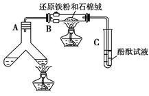 实验题 如图所示“合成氨”的演示实验(夹持仪器均已省略)。在Y形管的一侧用Zn粒和稀H2SO4反应制取H2,另一侧用NaNO2固体和NH4Cl饱和溶液反应制取N2,N2和H2混合后通过还原铁粉来合成NH3,再将产生的气体通入酚酞试液中,若酚酞试液变红,则说明产生了氨气。