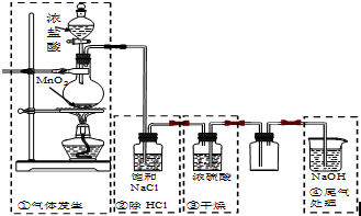 解答:依据装置图分析①是氯气制备;利用二氧化锰和浓盐酸加热反应,符合制备要求;②利用饱和氯化钠溶液吸收氯气中的氯化氢气体,洗气装置长进短出符合吸收原理;③利用浓硫酸除去氯气中的水蒸气,洗气装置导气管需要长进短出,装置导气管位置错误;④尾气吸收装置,防止污染空气,符合实验要求;