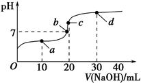 | 溶液 | 氨水 | 氢氧化钠溶液 | 醋酸溶液 | 盐酸 ? A.相同体积③、④溶液分别与NaOH完全反应,消耗NaOH物质的量:③>④ B.分别加水稀释10倍,四种溶液的pH ①>②>④>③?????? C.①、④两溶液等体积混合,所得溶液中c(Cl-)>c(NH4+)>c(OH-)>c(H+) D.Va?L ④溶液与Vb?L ②溶液混合(近似认为混合溶液体积=Va + Vb),若混合后溶液 pH = 4,则Va?: Vb =" 11" : 9 参考答案:C 本题解析: 本题难度:一般 3、选择题 室温时,向20 mL 0.1 mol·L-1醋酸溶液中不断滴入0.1 mol·L-1 NaOH溶液,溶液的pH变化曲线如下图所示。在滴定过程中,下列关于溶液中离子浓度大小关系的描述,不正确的是( )。 参考答案:AC 本题解析:a点相当于是CH3COOH与CH3COONa以物质的量1∶1混合的体系,溶液呈酸性,故c(CH3COO-)>c(Na+)>c(CH3COOH)>c(H+)>c(OH-),A错误;c点相当于是CH3COONa溶液,故存在质子守恒:c(OH-)=c(CH3COOH)+c(H+),C错误。 本题难度:一般 4、选择题 若1体积硫酸恰好与10体积pH=11的氢氧化钠溶液完全反应,则二者物质的量浓度之比应为( ) 参考答案:B 本题解析:酸碱中和时n(H+)酸=n(OH-)碱,即: 本题难度:简单 5、选择题 下列热化学方程式中,△H能正确表示物质的燃烧热的是 参考答案:C 本题解析: 本题难度:一般 |