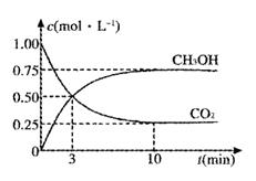 (4)为探究用CO2来生产燃料甲醇的反应原理,现进行如下实验:在一恒温恒容密闭容器,充人1mol CO2和3molH2,进行反应。测得CO2和CH3OH(g)的浓度随时间变化如图所示。