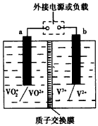 2、选择题 某蓄电池的原理如图所示,以28%的硫酸为电解质溶液,a、b均为惰性电极,充电过程中左槽离子变化 情况为VO2+→VO2+。下列叙述不正确的是 [???? ]