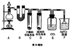 5、实验题 (16分)某校化学实验兴趣小组为了探究在实验室制备Cl2的过程中有水蒸气和HCl挥发出来,同时证明氯气的某些性质,甲同学设计了如下图所示的实验装置(支撑用的铁架台省略),按要求回答问题。(B中装的是无水硫酸铜)