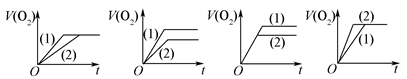 2、选择题 在相同条件下,取等量H2O2做H2O2分解的对比实验,其中(1)加入MnO2催化,(2)不加MnO2催化。下图是反应放出O2的体积随时间的变化关系示意图,其中正确的是( )A. B. C. D.