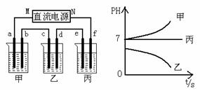3、填空题 A、B、C三种强电解质,它们在水中电离出的离子为Na+ 、Ag+、NO3-、SO42-、 Cl-,在如图所示装置中,甲、乙、丙三个烧杯依次分别盛放足量的A、 B、 C三种溶液,电极均为石墨电极。接通电源,经过一段时间后,测得乙烧杯中c电极质量增加了10.8克。常温下各烧杯中溶液的pH与电解时间t的关系如图所示。据此回答下列问题: