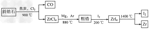 1、填空题 锆(?)主要用于核反应堆燃料棒的包层,这是因为含有1.5%Sn的锆合金具有在辐射下稳定的抗腐蚀性和机械性。以斜锆石(ZrO2)生产金属锆的生产过程示意图如下