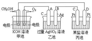 (4)当乙池中B极的质量增加5.4g时,甲池中理论上消耗O2的体积为????L(标况下),此时丙池中???电极(填“C”或“D”)析出1.6g某金属,则丙池的某盐溶液可能是?????(填序号)?????