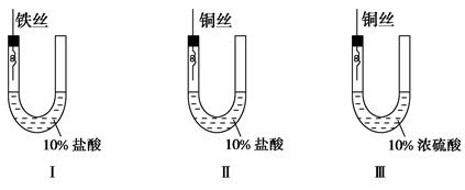 本题解析:有关金属腐蚀的题型,要求搞清金属腐蚀的主要原因(电化学腐蚀),运用原电池原理进行恰当的分析,同时掌握金属防护的基本方法:改变金属内部结构(如制成合金)、涂保护层和电化学保护法。Ⅱ中铁钉与铜丝相连,金属活泼性相差较大,且用挥发性盐酸,因此装置Ⅱ中的铁钉腐蚀最严重,C项正确;Ⅰ中虽然也用了盐酸,但铁钉与铁丝相连,腐蚀不及Ⅱ;由于均发生了2H++2e-=H2↑,Ⅰ和Ⅱ均生成了气体,液面都会下降,左侧液面装置Ⅱ比装置Ⅰ的低,A项正确,B项错误;Ⅲ中虽然铁钉?也与铜丝相连,但由于所装试剂为不挥发性硫酸,因此铁钉几乎