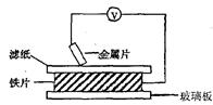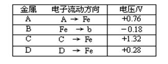 5、填空题 将洁净的金属片A、B 、C、D 分别放置在浸有盐溶液的滤纸上面并压紧(如图所示)。在每次实验时,记录电压指针的移动方向和电压表的读数如右表所示: