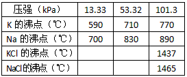NaCl(l)+K(g)-Q 该反应的平衡常数可表示为:K=C(K)各物质的沸点与压强的关系见下表。