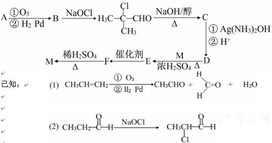 1、简答题 (16分)有机玻璃(聚甲基丙烯酸甲酯)F,具有透光性好,质轻,耐水,耐酸、碱等性能。常用于制飞机,汽车,光学仪器,医疗器械等。它的一种合成路线如下图所示(部分产物已省略)。