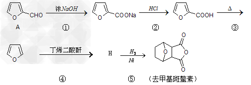 4、填空题  斑螯素能抑制肝癌的发展,去掉斑螯素中的两个甲基制得的化合物——去甲基斑螯素仍具有相应的疗效,其合成路线如下:????????????