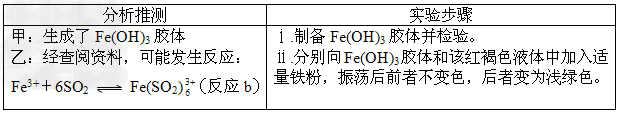 ①?该反应的离子方程式是___________________(反应a)。为验证该反应,同学们将SO2通入0.05?mol·L-1?FeCl3溶液中,溶液很快由黄色变为红褐色;将溶液长时间放置后,最终变为浅绿色。关于红褐色液体,以下是同学们的分析推测与实验。