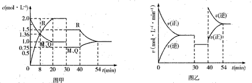 2R(g),达到平衡后,只改变反应的一个条件,测得容器中物质的浓度、反应速率随时间的变化如图甲、乙所示。下列说法正确的是