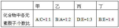 2、填空题 有原子序数依次增大的A、B、C、D、E五种短周期元素,它们可两两组成甲、乙、丙、丁四种化合物,各化合物中原子个数比关系如下表