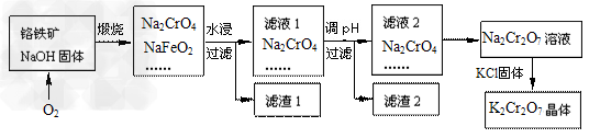 4、填空题 铬铁矿的主要成分可表示为FeO·Cr2O3,还含有SiO2、Al2O3等杂质,以铬铁矿为原料制备重铬酸钾(K2Cr2O7)的过程如下图所示。