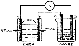 (3)甲烷——空气燃料电池是一种碱性燃料电池,电解质溶液是20%-30%的KOH溶液。现用甲烷——空气燃料电池进行下图所示实验(其中a、b均为碳棒):