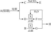 | 完全沉淀时的pH范围 | ≥9.6 | ≥6.4 | 3~4 ⑴溶液A中加入NaClO的目的是????????????????????????????????????; ⑵在溶液B中加入CuO的作用是????????????????????????????????????; ⑶操作a的目的是?????????????????????????????????????????????????; ⑷在Cu(OH)2加入盐酸使Cu(OH)2转变为CuCl2。采用多量盐酸和低温蒸干的目的是????????????????????????????????????????????。 参考答案:⑴?将Fe2+氧化为Fe3+而使分离更加完全 本题解析:略 本题难度:一般 5、填空题 A为无色晶体,B为淡黄色固体;X、C、E、G均为气体。其相关关系如图1-12所示: 参考答案:(1)Cl2? Na?(2)2NaClO2+Cl2====2 本题解析:“晶体A常用作城市道路融雪剂”是本题的题眼——A是氯化钠;电解熔融的氯化钠可得钠和氯气;氯气与NaClO2得到的气体消毒剂应是二氧化氯;钠在氧气中点燃可得过氧化钠;硫在空气中点燃则得到二氧化硫;二氧化硫与过氧化钠反应生成的是硫酸钠。 本题难度:简单 |