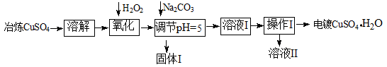 (4)加入Na2CO3后,CO32?与Ca2+反应生成CaCO3沉淀,Fe3+开始沉淀的pH分别2.7,完全沉淀的pH分别为3.7,所以pH调节至5时,Fe3+转化为Fe(OH)3沉淀,所以固体I的主要成分除 FeAsO4外还有Fe(OH)3、CaCO3;根据流程图可知经过操作I得到电镀硫酸铜和溶液II,则操作I为:蒸发浓缩、冷却结晶、过滤干燥。