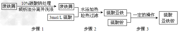 3、实验题 已知硫酸亚铁铵晶体为浅绿色,易溶于水、不溶于乙醇,在水中的溶解度比FeSO4和(NH4)2SO4都要小;能水解;具有还原性,但比硫酸亚铁稳定。以下是将绿矾(FeSO4·7H2O)、硫酸铵以相等物质的量混合可制得摩尔盐晶体的流程图。