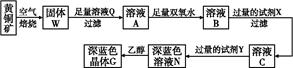 4、填空题 工业上以黄铜矿(主要成分是CuFeS2,杂质不溶于水和酸)为原料,制备蓝色晶体G,其化学式为[Cu(NH3)4]SO4·H2O,涉及流程如下:
