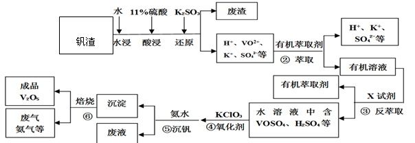 (2)从流程图中可看出,加入反萃取剂X后,又得到有机萃取剂和含V元素的混合液,根据R2(SO4)n(水层)+2nHA(有机层)2RAn(有机层) + nH2SO4(水层)可知,该平衡应逆向进行,所以加入的X是硫酸;