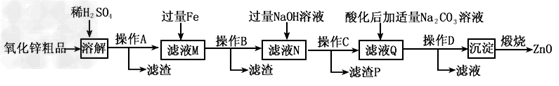 1、填空题 活性氧化锌用作橡胶硫化的活性剂、补强剂。以氧化锌粗品(含铁的氧化物、CuO和SiO2等杂质)为原料制备活性氧化锌并生产其它副产品的生产工艺流程如下