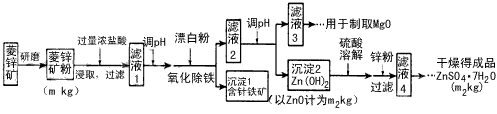 4、填空题 硫酸锌可作为食品锌强化剂的原料。工业上常用菱锌矿生产硫酸锌,菱锌矿的主要成分是ZnCO3,并含少量的Fe2O3、FeCO3、MgO、CaO等,生产工艺流程示意如下