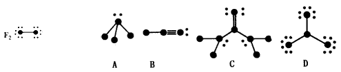 4、填空题 列物质结构图中,●代表原子序数从1到10的元素的原子实(原子实是原子除去最外层电子后剩余的部分),小黑点代表未用于形成共价键的最外层电子,短线代表价键。示例: