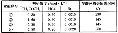 1、选择题 某探究小组利用丙酮的溴代反应(CH3COCH3+Br2→CH3COCH2Br+HBr)来研究反应物浓度与反应速率的关系。反应速率v(Br2)通过测定溴的颜色消失所需的时间来确定。在一定温度下,获得如下实验数据: