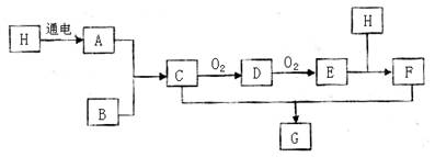 已知下图中H是无色液体,号称生命之源,B是空气中含量最多的物质,E是红棕色气体。