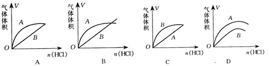 1、选择题 进行如下实验,在A锥形瓶中放入10g块状CaCO3,在B锥形瓶中放入5g粉末状CaCO3,分别加入50mL2mol/L盐酸。下图中能正确表示实验结果的是(???)